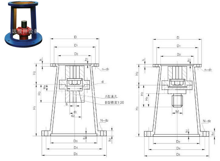 本机架适用于摆线针轮减速机的联接,配刚性联轴器,上联轴器装JA型直孔,下联轴器装A型直孔或B型锥孔,锥度为1:20的联轴器。该机架无支承适用于反应器传来的轴向力不大时使用。